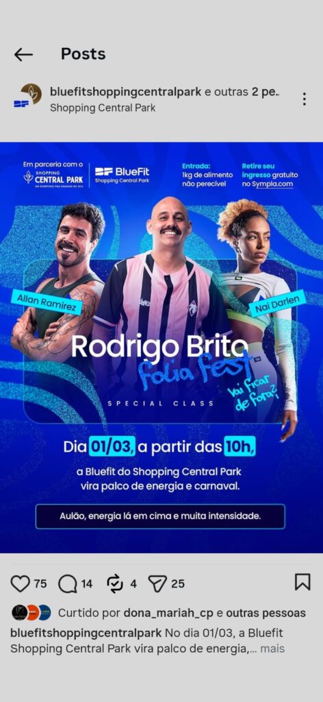 “Neste Carnaval, nos empenhamos em promover atividades de entretenimento às famílias. O ‘aulão’ da Bluefit é uma iniciativa que promove o bem-estar físico e mental e será uma oportunidade para o público cair na folia de forma saudável”, comenta Rafaela Costa, coordenadora de marketing do Shopping Central Park.