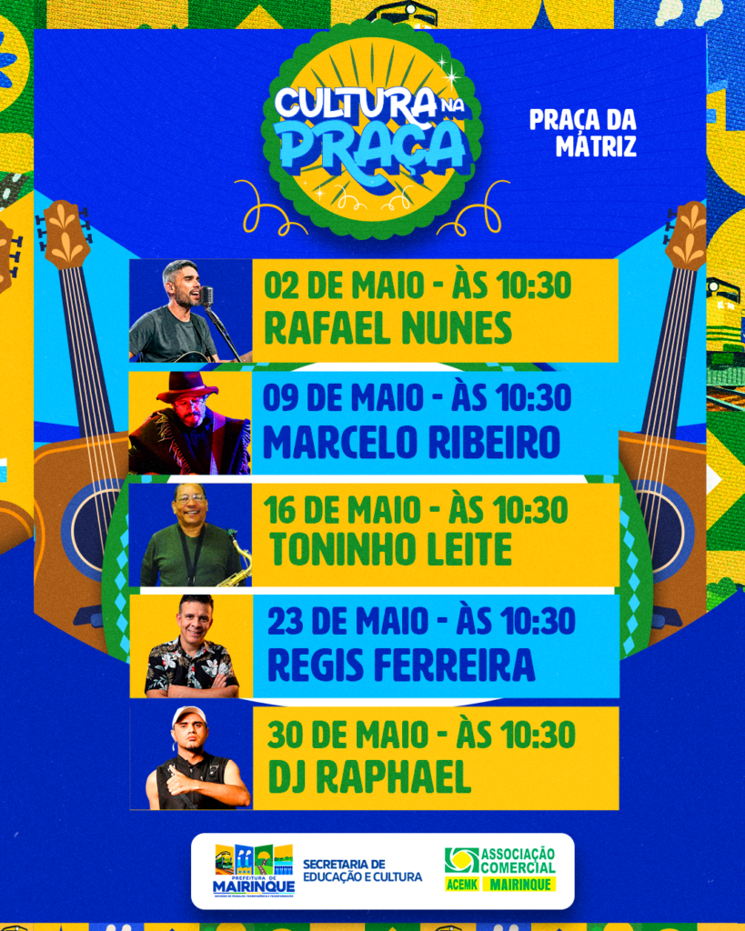 A Prefeitura de Mairinque, por meio da Secretaria de Educação e Cultura, realiza o Cultura na Praça, que leva apresentações musicais de artistas locais à Praça da Matriz, sempre aos sábados, às 10h30, integrando a programação da tradicional Feira de Artesanato.