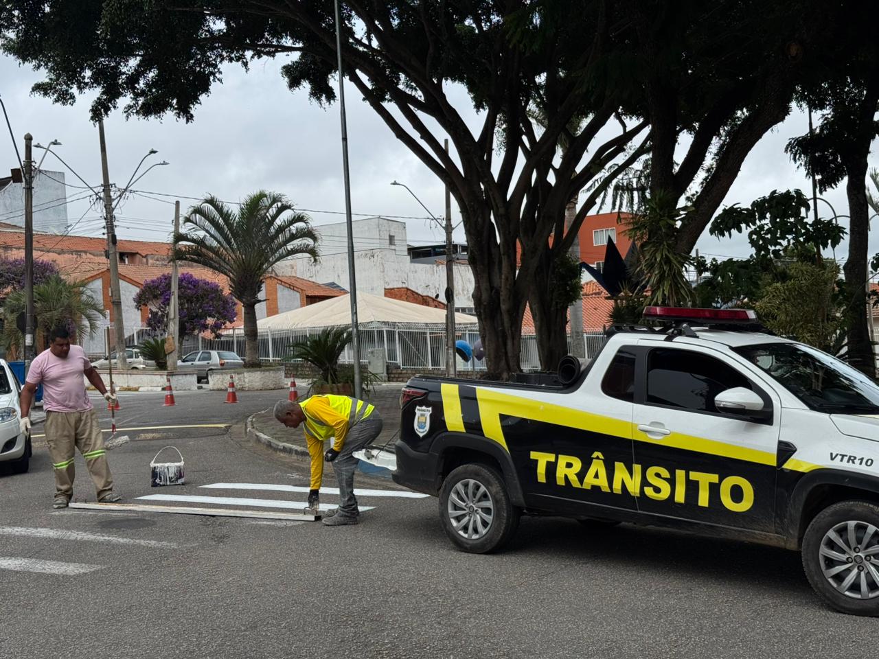 Entre os serviços executados estão a pintura de faixas de pedestres, faixas de retenção e demais marcações viárias, contribuindo para a prevenção de acidentes e para a fluidez do trânsito, especialmente em locais de maior circulação.