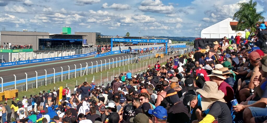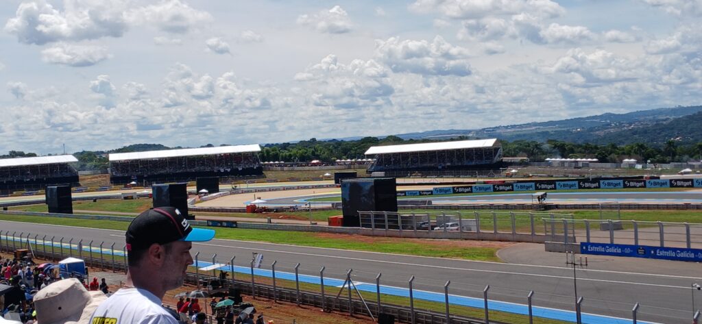 O dia começou com muita chuva, o que atrasou o primeiro treino da Moto3 em aproximadamente 1 hora. Posicionado na segunda fileira da reta principal, pude perceber que os novatos parecem ter “um parafuso a menos”, mas compensam com uma habilidade impressionante. As motos de 250cc atingem mais de 210 km/h.