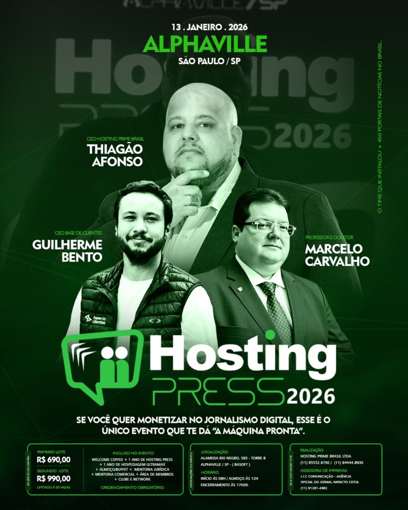 Alphaville, SP – No dia 13 de janeiro de 2026, jornalistas, comunicadores e donos de portais de notícias de todo o Brasil têm um encontro marcado em Alphaville, na Grande São Paulo. É o HostingPRESS 2026, evento presencial que promete ir além dos cursos tradicionais e mostrar, na prática, como transformar um portal de notícias em um negócio estruturado, recorrente e valorizado perante prefeituras, órgãos públicos e empresas privadas.