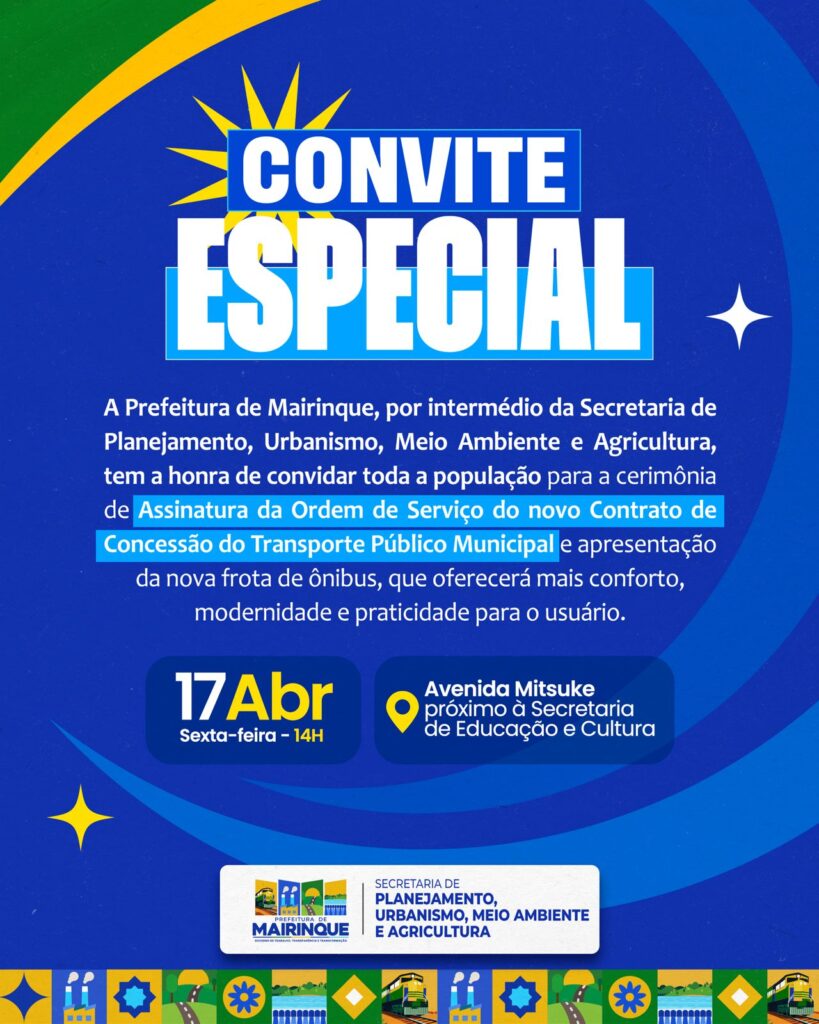 A Prefeitura de Mairinque, por meio da Secretaria de Planejamento, Urbanismo, Meio Ambiente e Agricultura, realiza nesta sexta-feira, 17 de abril, às 14h, a cerimônia de assinatura da Ordem de Serviço do novo Contrato de Concessão do Transporte Público Municipal, acompanhada da apresentação oficial da nova frota de ônibus que passará a atender a população.