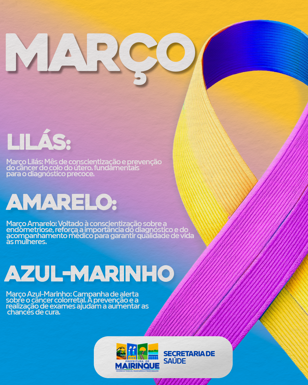 O mês de março é marcado por importantes campanhas de conscientização em saúde, que reforçam a importância da prevenção, do diagnóstico precoce e do acompanhamento médico. A Prefeitura de Mairinque, por meio da Secretaria de Saúde, apoia e divulga as campanhas Março Lilás, Março Amarelo e Março Azul-Marinho.