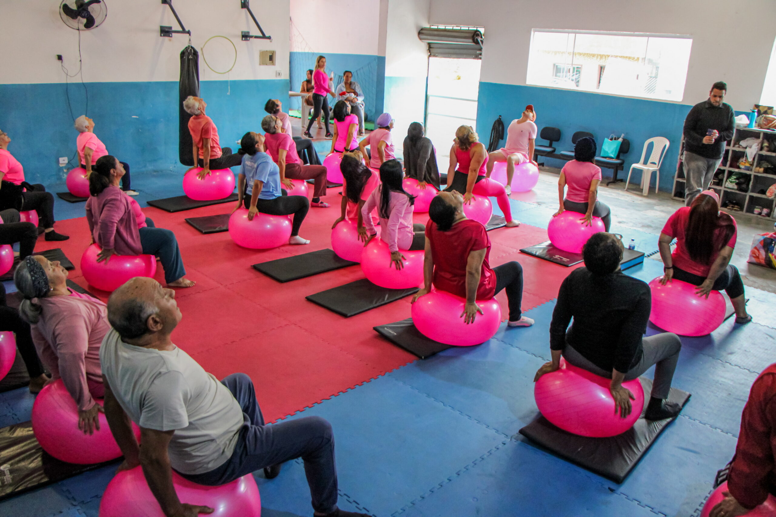 Aula de Pilates Especial – Outubro Rosa, realizada pela Secretaria da Juventude, Esporte e Lazer de Pirapora no dia 8 de outubro