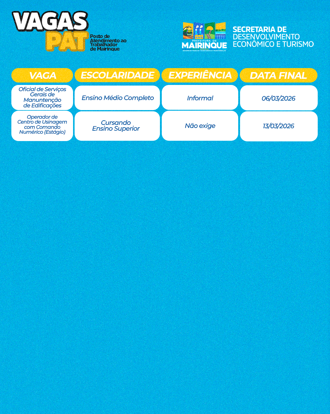 A Prefeitura de Mairinque, por meio da Secretaria de Desenvolvimento Econômico, anuncia as vagas disponíveis no Posto de Atendimento ao Trabalhador (PAT). São mais de 15 oportunidades em diversos segmentos.