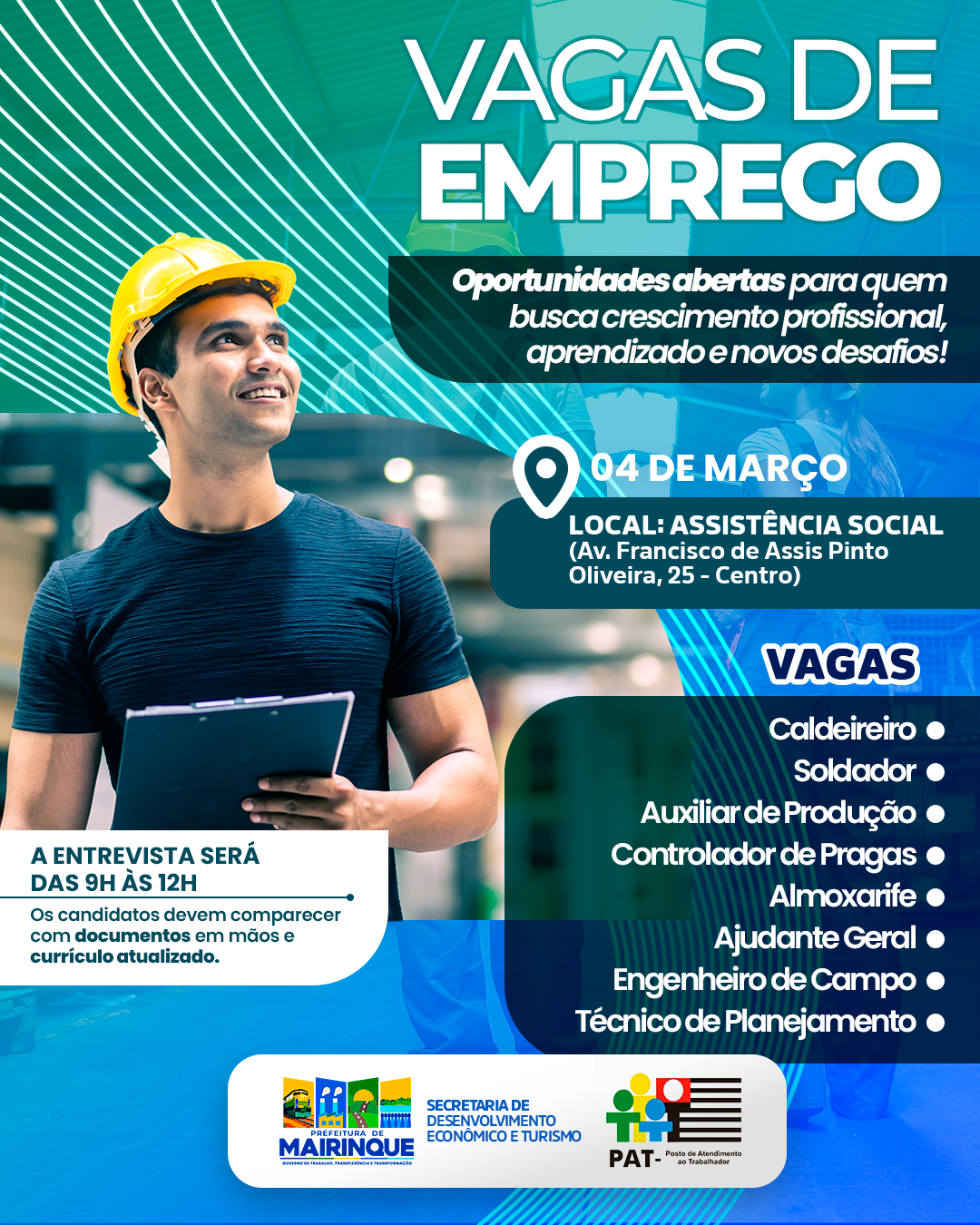No dia 4 de março, serão realizadas entrevistas presenciais para o preenchimento de diversas vagas de emprego, com oportunidades destinadas a quem busca crescimento profissional, aprendizado e novos desafios no mercado de trabalho. As entrevistas acontecerão das 9h às 12h, na Assistência Social, localizada na Avenida Francisco de Assis Pinto Oliveira, nº 25 – Centro. Os candidatos devem comparecer com documentos pessoais em mãos e currículo atualizado.