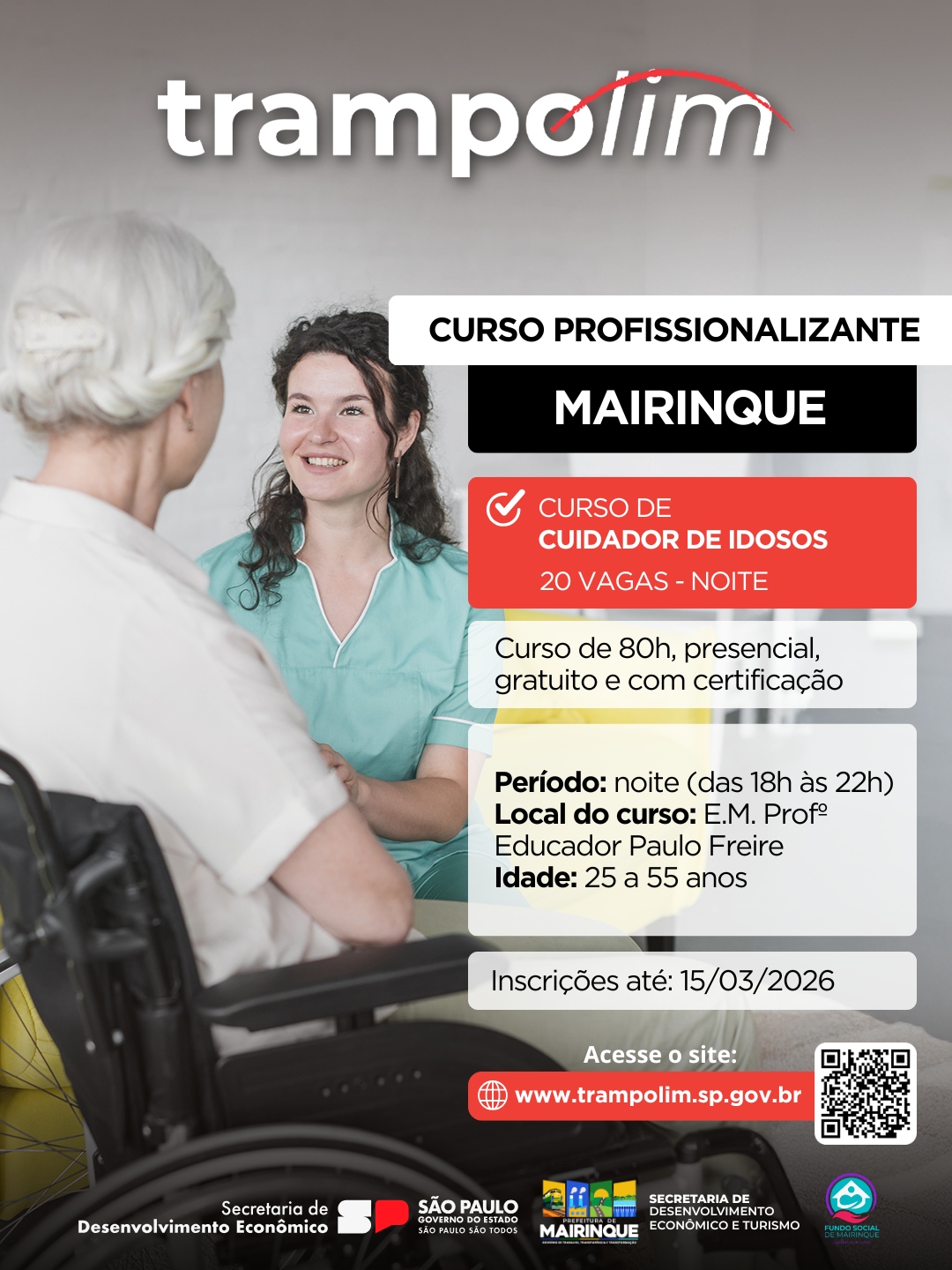 A Prefeitura de Mairinque, por meio da Secretaria de Desenvolvimento Econômico e apoio do Fundo Social Acolher com Amor, informa que estão abertas as inscrições para o Curso de Cuidador de Idosos, oferecido gratuitamente por meio do Programa Trampolim, iniciativa do Governo do Estado de São Paulo voltada à qualificação profissional e à inserção no mercado de trabalho.