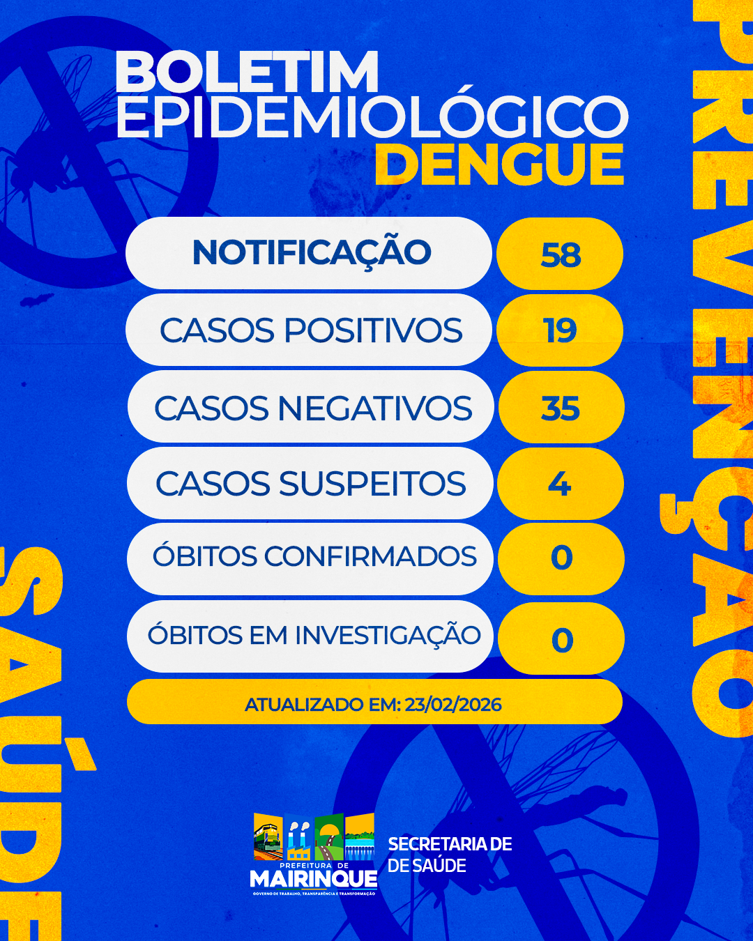 A Prefeitura de Mairinque, por meio da Secretaria de Saúde, divulga a atualização do Boletim Epidemiológico da Dengue, com dados atualizados em 23 de fevereiro.