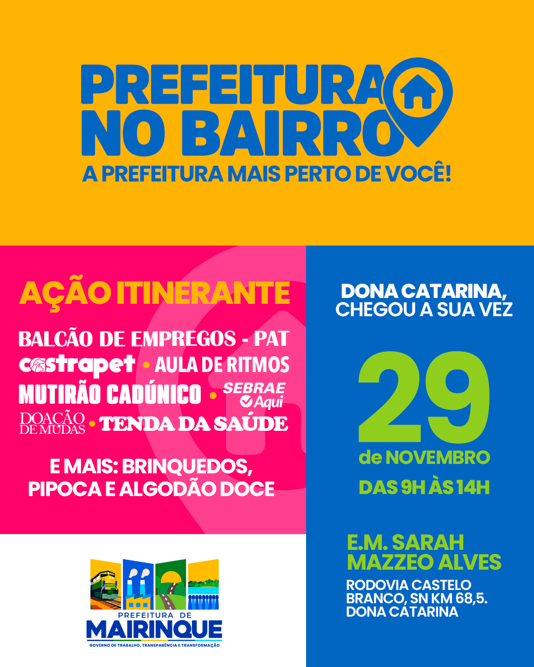 A Prefeitura de Mairinque convida todos os moradores do bairro Dona Catarina e regiões vizinhas a participarem desse dia especial, aproveitando os serviços gratuitos e vivenciando um momento de integração comunitária.