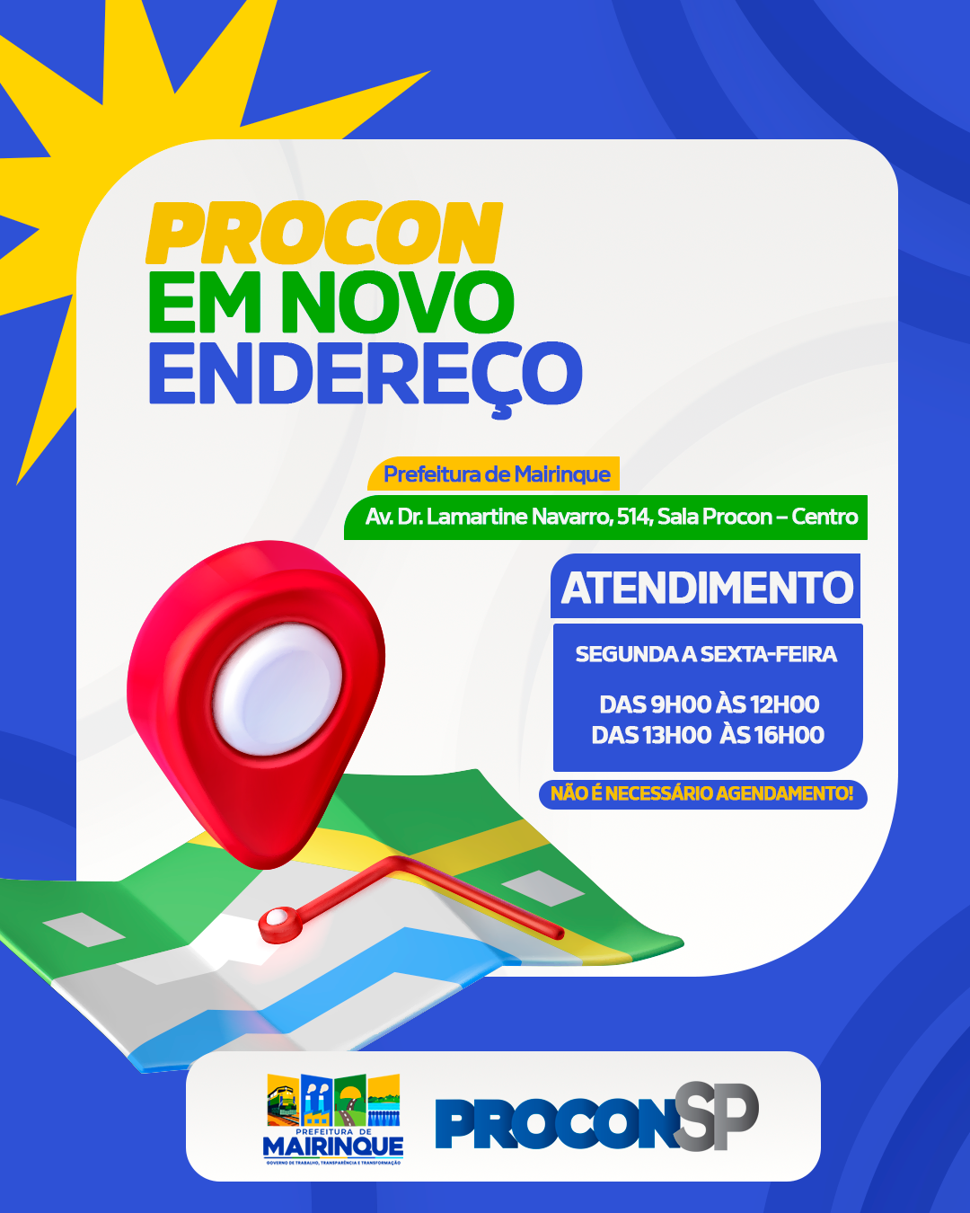 O atendimento agora é realizado na Prefeitura de Mairinque, localizado na Avenida Dr. Lamartine Navarro, nº 514, sala Procon, no Centro, em um espaço mais adequado para acolher a população com mais comodidade e organização.