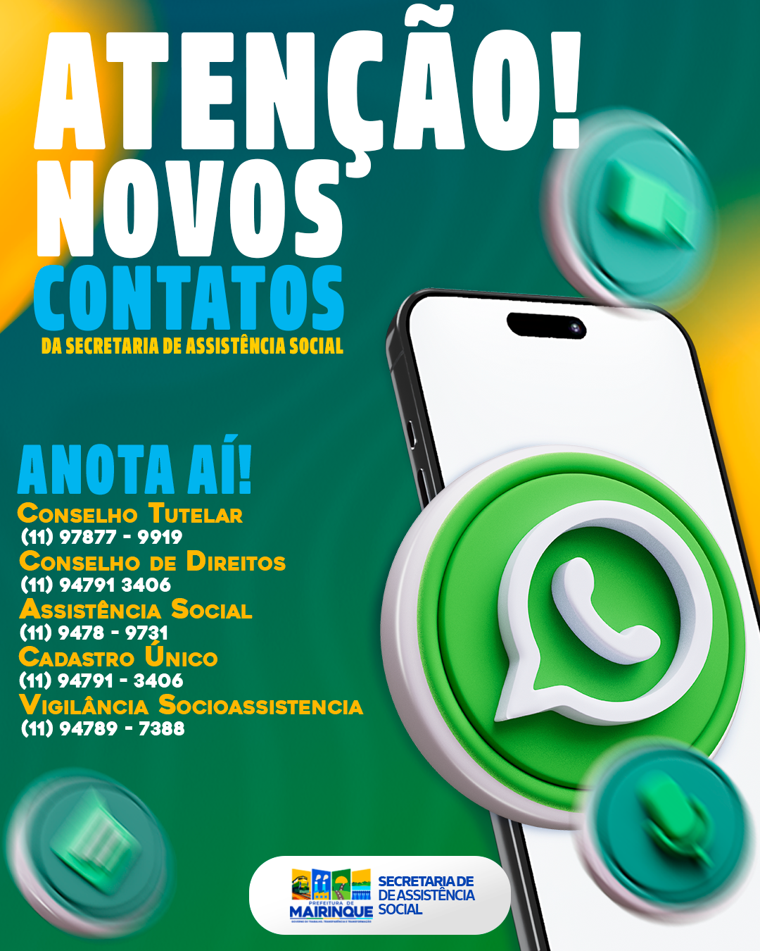 A Prefeitura de Mairinque, por meio da Secretaria de Assistência Social, informa à população que foram atualizados os canais oficiais de contato dos principais serviços da pasta. A iniciativa tem como objetivo ampliar a comunicação, agilizar o atendimento e garantir mais facilidade no acesso às orientações e serviços oferecidos aos munícipes.