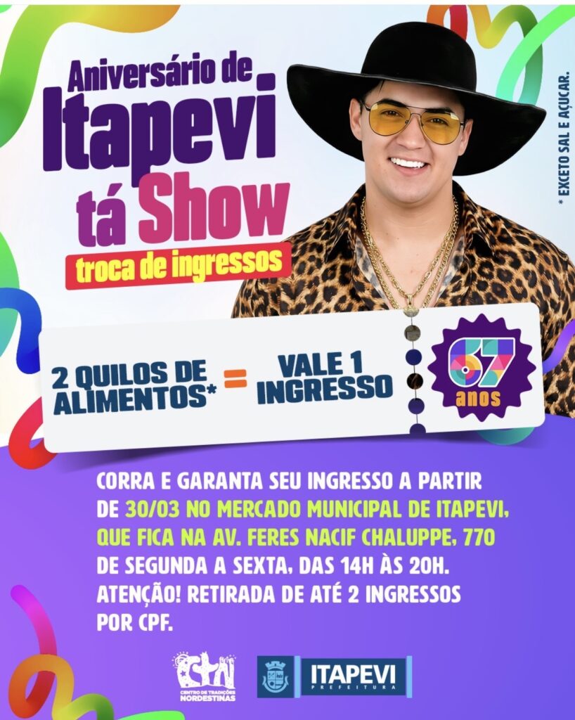 A troca de ingressos para o show do Natanzinho Lima está de volta nesta segunda-feira, em Itapevi. A partir das 14h até as 20h, a população poderá garantir o ingresso no Mercadão de Itapevi.