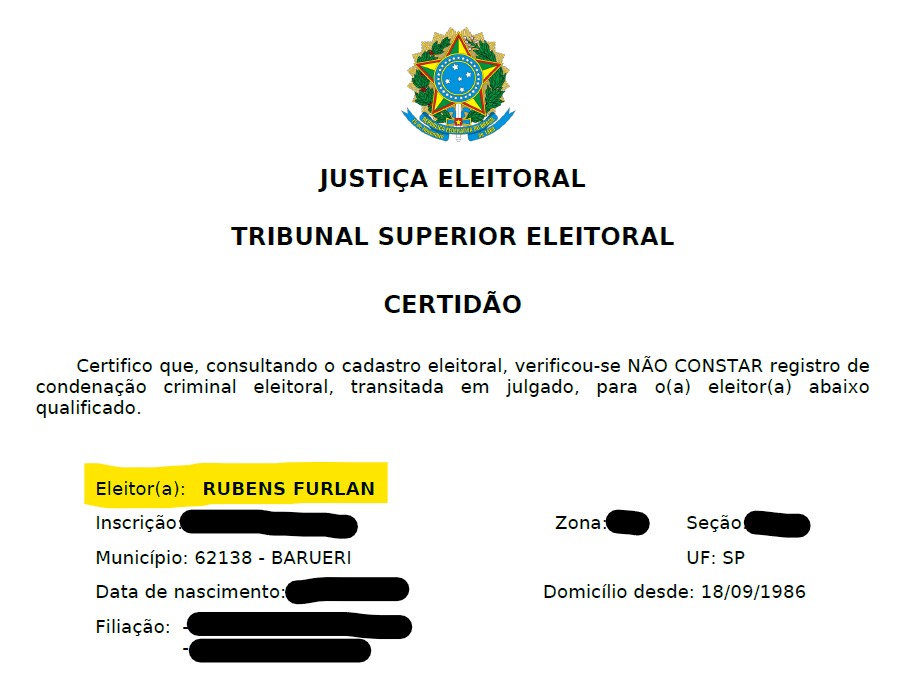 A certidão foi emitida após consulta ao cadastro eleitoral oficial e comprova a regularidade plena da situação eleitoral de Furlan, reforçando sua idoneidade diante da Justiça.